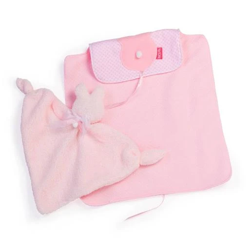 Este cambiador de 30 x 40 cm, en color rosa con estampado posterior y detalle en forma de conejo en el cierre frontal, tiene cintas para atar y cerrar.
