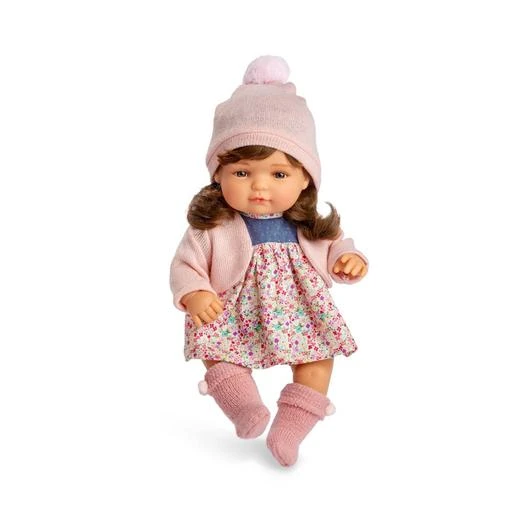 Esta muñeca tiene el pelo moreno y largo con flequillo. Sus ojos son azules. Lleva un vestido tejido con brillantina y de una tela estampada de flores. También lleva pololos en color marino y una chaqueta y gorro de lana lisa color rosa salmón. Sus calcetines son de color rosa asalmonado y tienen dos pompones.