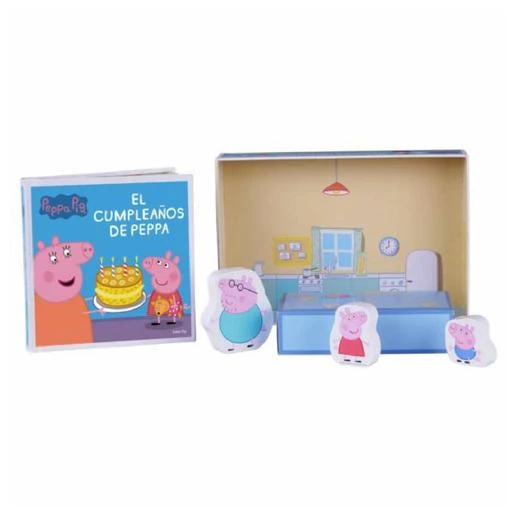 El cumpleaños de Peppa, un libro de tapa dura con 10 páginas y 3 figuras de madera.
