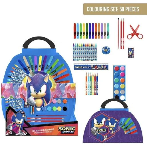 El conjunto de papelería y material escolar Sonic no solo cuenta con láminas para colorear, sino que también ofrece pegatinas, bolígrafos, libretas y más, todos decorados con los personajes más icónicos de Sonic. Este conjunto tiene todo lo necesario para que los niños puedan explotar su imaginación y creatividad al máximo.