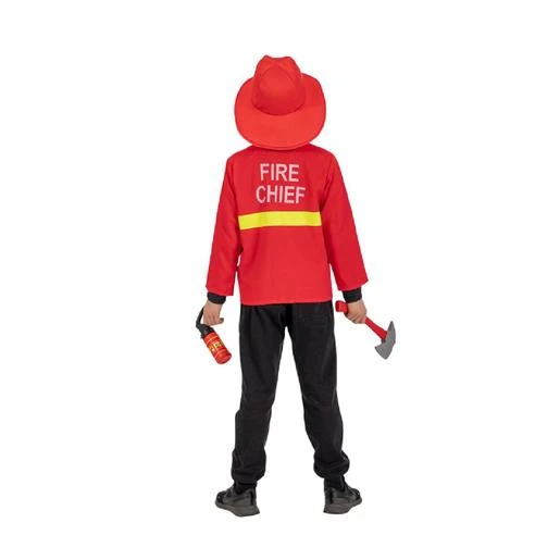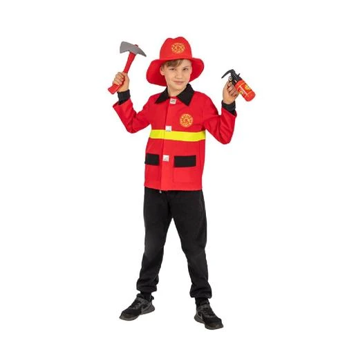 Este disfraz consta de una chaqueta de tela roja, un extintor de incendios falso y un hacha de plástico.