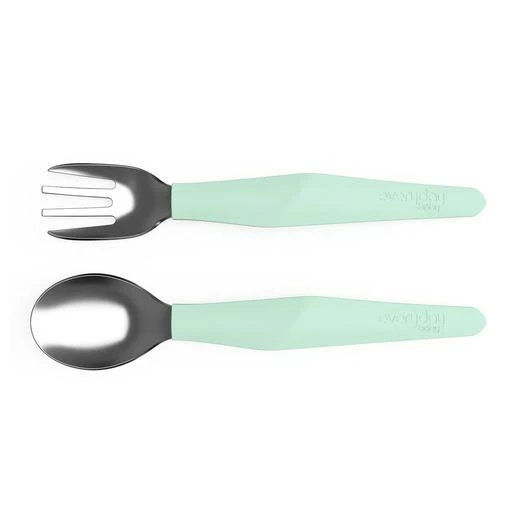 Set de cubiertos para bebé menta, un set de cuchara y tenedor de color verde menta.